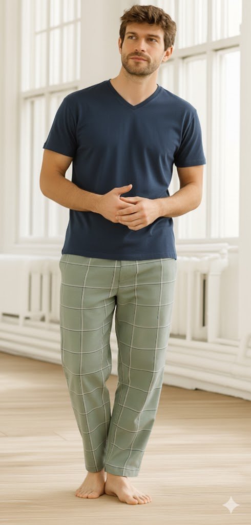 Pijama Hombre Pantalón Cuadros Verdes en Algodón Afelpado + Camiseta Café o Azul