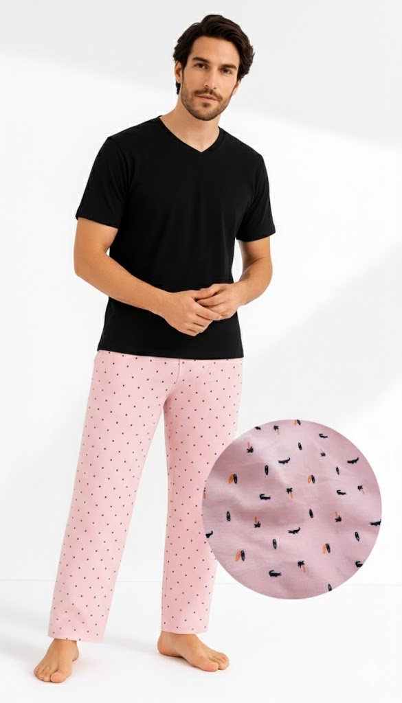 Pijama Hombre con Pantalón Náutica Rosa en Algodón + Camiseta Azul o Negra en Piel de Durazno