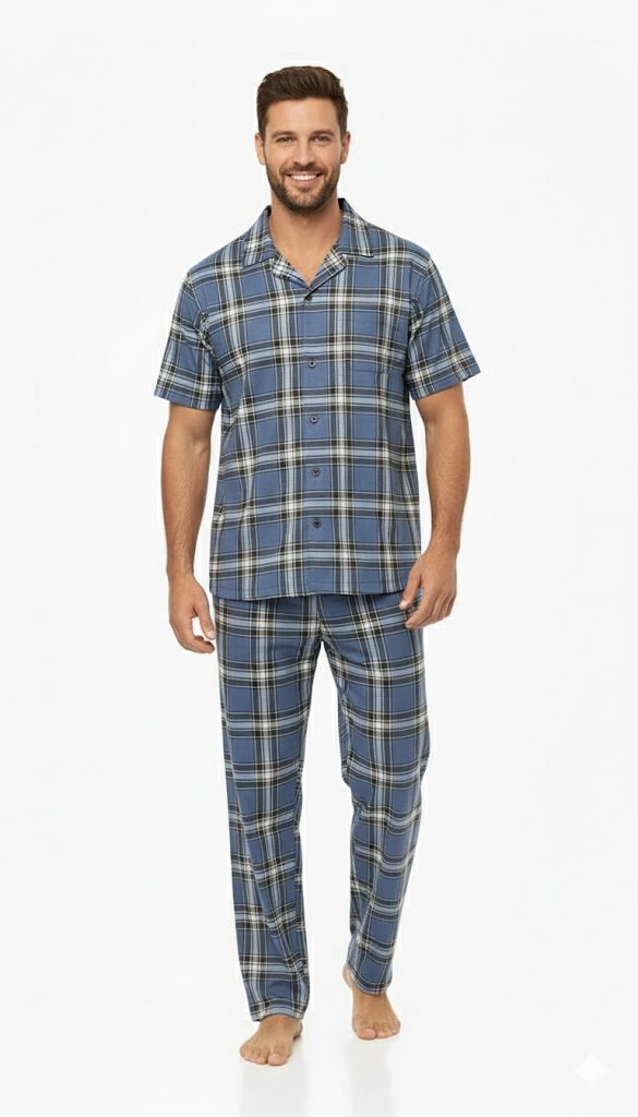 Pijama Hombre Conjunto Cuadros Oscuros Camisa Manga Corta en Algodón en Bermuda o Pantalón