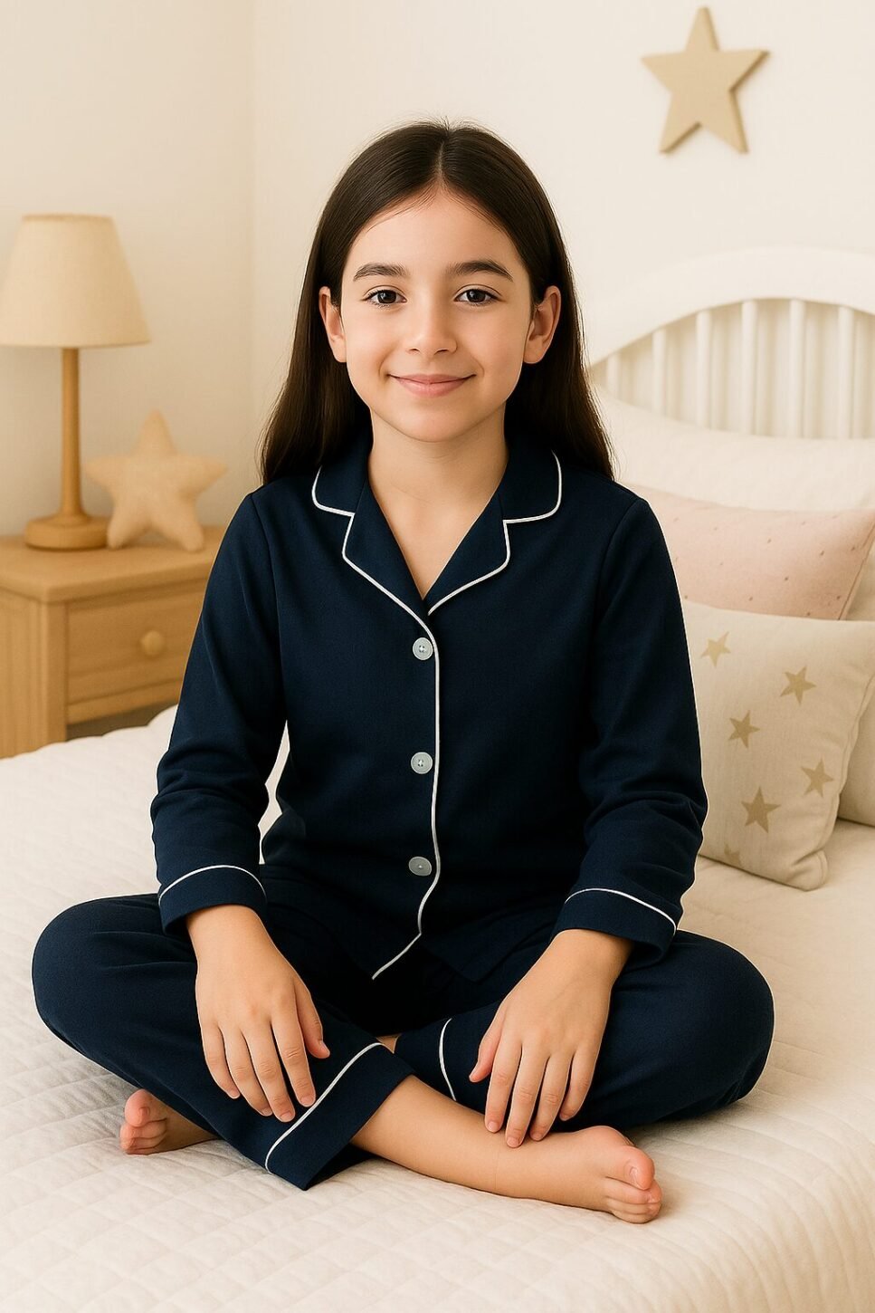 Ligera, suave y perfecta para soñar. Esta pijama para niñas con pantalón en seda liviana y camisa manga larga brinda frescura y libertad de movimiento con un toque delicado.